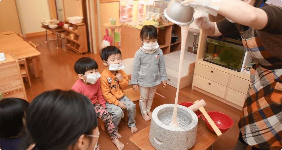 乳幼児期は味覚が形成される大切な時期です。栄養や旬の味わいへの配慮はもちろん、給食が楽しみな子どもたちのために、温かくておいしい食事を用意しています。